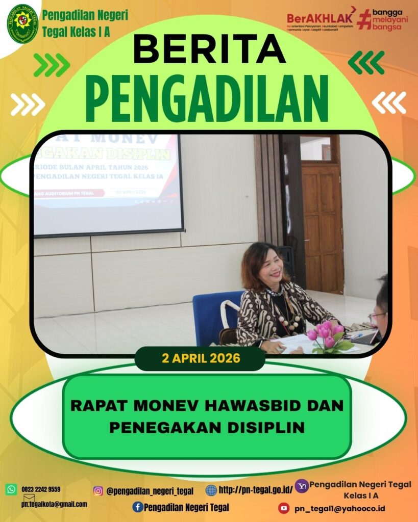 Tegal, 2 April 2026 — Pengadilan Negeri Tegal menyelenggarakan kegiatan Rapat Monitoring dan Evaluasi (Monev) Hakim Pengawas Bidang (Hawasbid) serta penegakan disiplin pada hari Kamis, 2 April 2026. Kegiatan tersebut dilaksanakan di Ruang Auditorium Pengadilan Negeri Tegal.