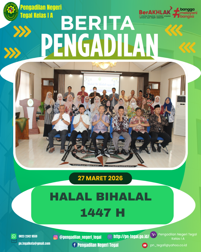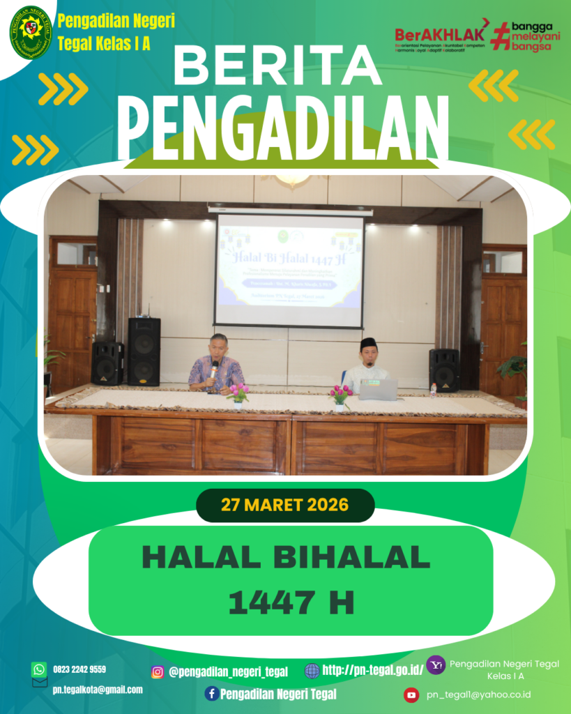 Tegal, 27 Maret 2026 — Pengadilan Negeri Tegal mengadakan acara pengajian dalam rangka Halal Bihalal 1447 Hijriah pada hari Jumat (27/3/2026). Kegiatan tersebut berlangsung di Ruang Auditorium Pengadilan Negeri Tegal dan diikuti oleh pimpinan, hakim, pejabat struktural dan fungsional serta seluruh pegawai pengadilan negeri tegal.