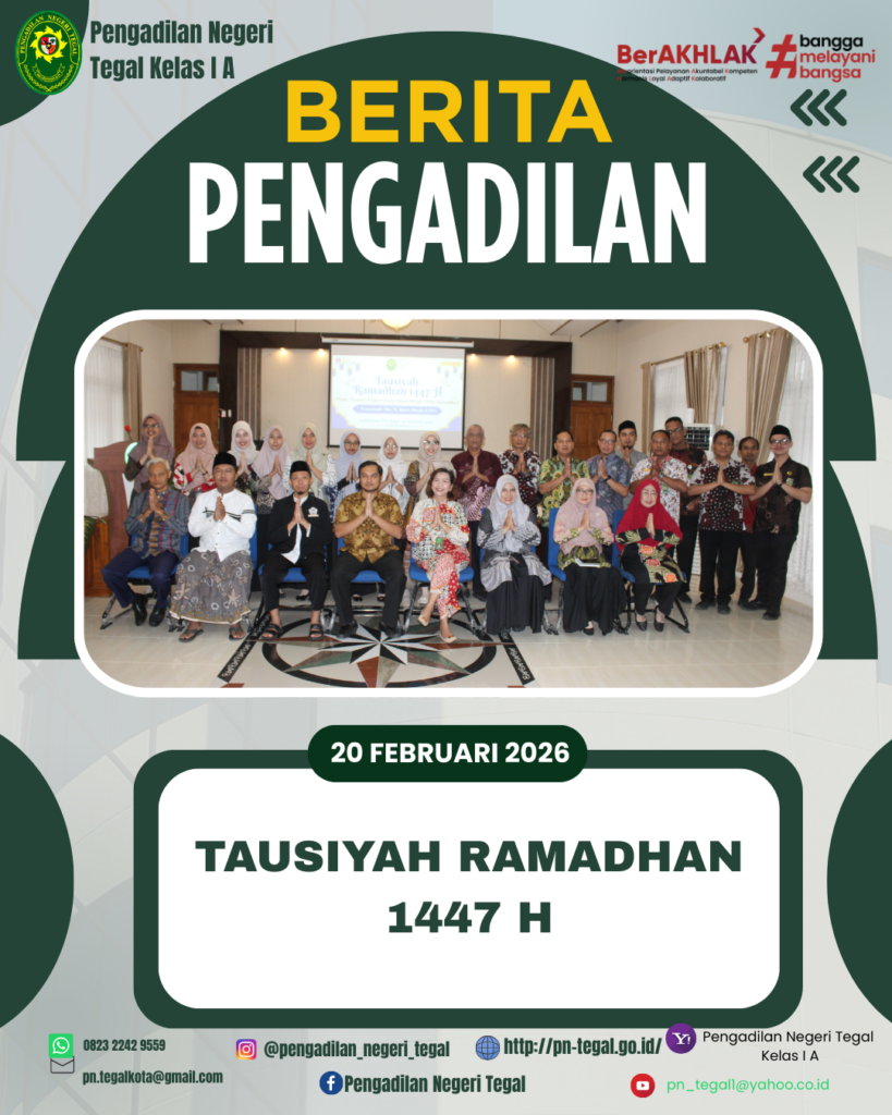 Tegal, 20 Februari 2026 – Pengadilan Negeri Tegal menggelar kegiatan Tausiyah Ramadhan 1447 Hijriah pada hari Jumat, 20 Februari 2026, bertempat di Ruang Auditorium Pengadilan Negeri Tegal. Kegiatan ini diikuti oleh Wakil Ketua, para hakim, pejabat struktural dan fungsional, serta seluruh aparatur Pengadilan Negeri Tegal.