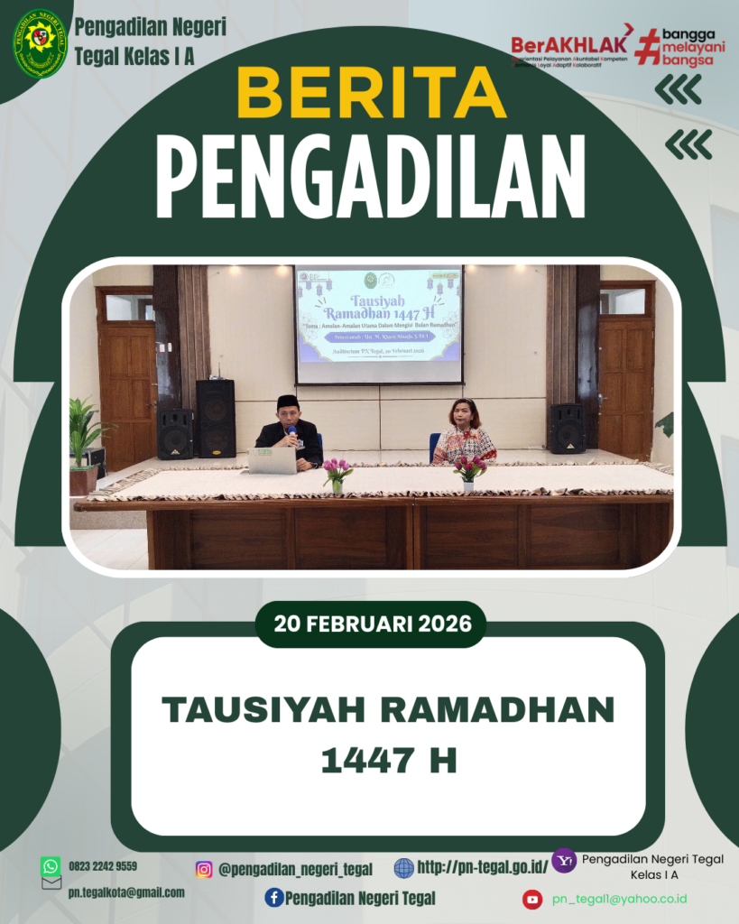Tegal, 20 Februari 2026 – Pengadilan Negeri Tegal menggelar kegiatan Tausiyah Ramadhan 1447 Hijriah pada hari Jumat, 20 Februari 2026, bertempat di Ruang Auditorium Pengadilan Negeri Tegal. Kegiatan ini diikuti oleh Wakil Ketua, para hakim, pejabat struktural dan fungsional, serta seluruh aparatur Pengadilan Negeri Tegal.