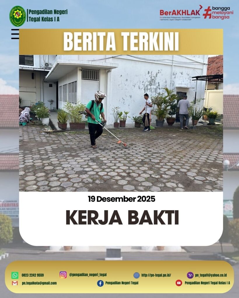 Pengadilan Negeri Tegal melaksanakan kegiatan kerja bakti di lingkungan kantor Pengadilan Negeri Tegal pada hari Jum’at, 19 Desember 2025 sebagai upaya untuk menjaga kebersihan, kerapian, dan kenyamanan lingkungan kerja. Kegiatan ini diikuti oleh seluruh aparatur Pengadilan Negeri Tegal.